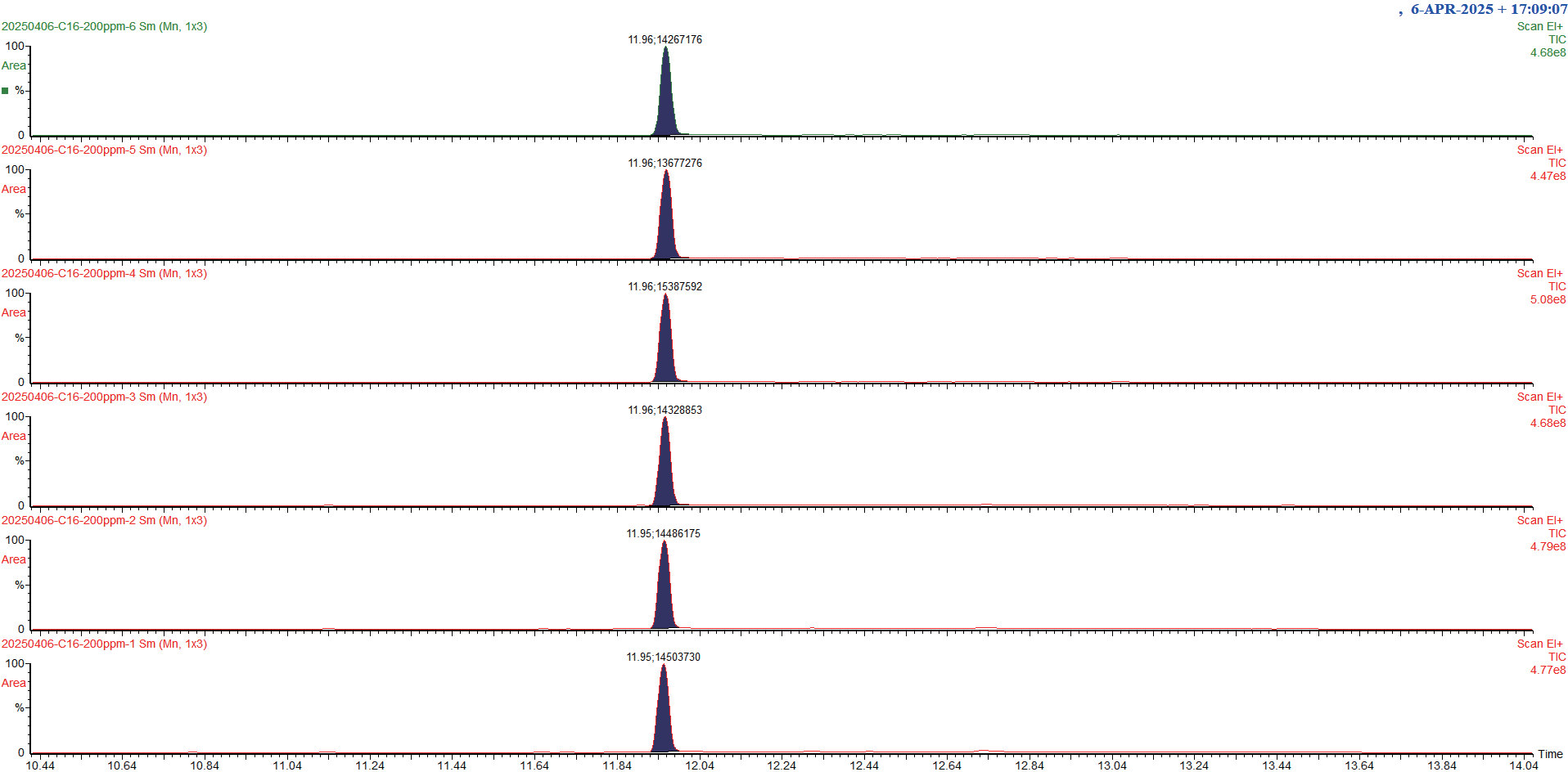 圖8.200ng C16連續(xù)6次進(jìn)樣標(biāo)準(zhǔn)圖譜(點(diǎn)擊查看大圖)