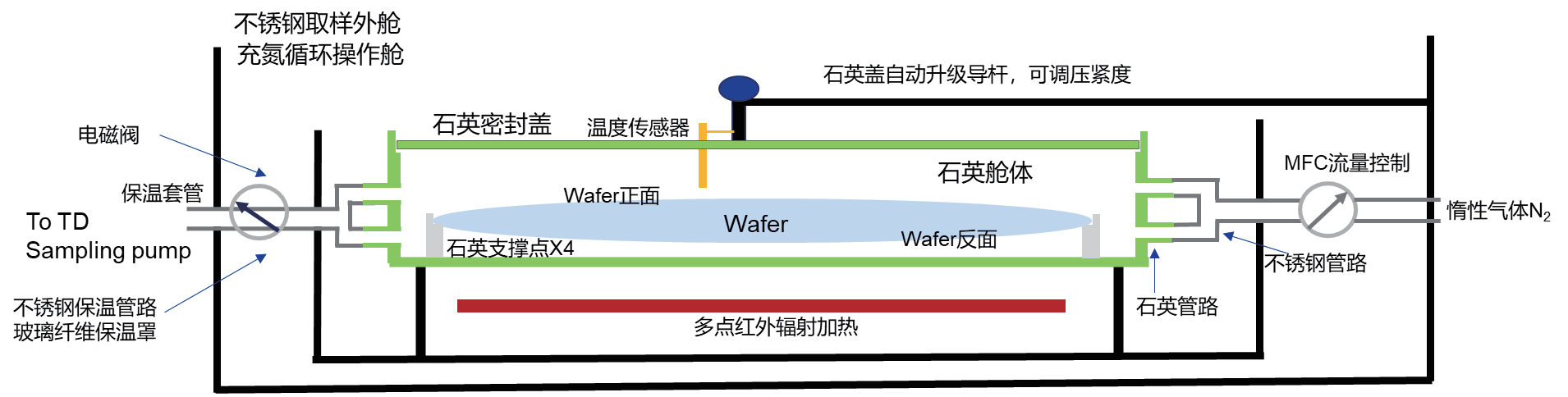 硅片加熱系統(tǒng)的結(jié)構(gòu)示意圖如圖3所示,整套系統(tǒng)為石英材質(zhì),采用紅外輻射加熱的方式進(jìn)行加熱,升溫速率快,溫度控制精準(zhǔn)。樣品艙經(jīng)過(guò)特殊設(shè)計(jì),可以對(duì)硅片兩面的有機(jī)物或者單面的有機(jī)物進(jìn)行分析,且適配各種不同尺寸的晶圓。樣品艙到熱脫附儀的管路全程加熱,防止高沸點(diǎn)有機(jī)物的殘留。