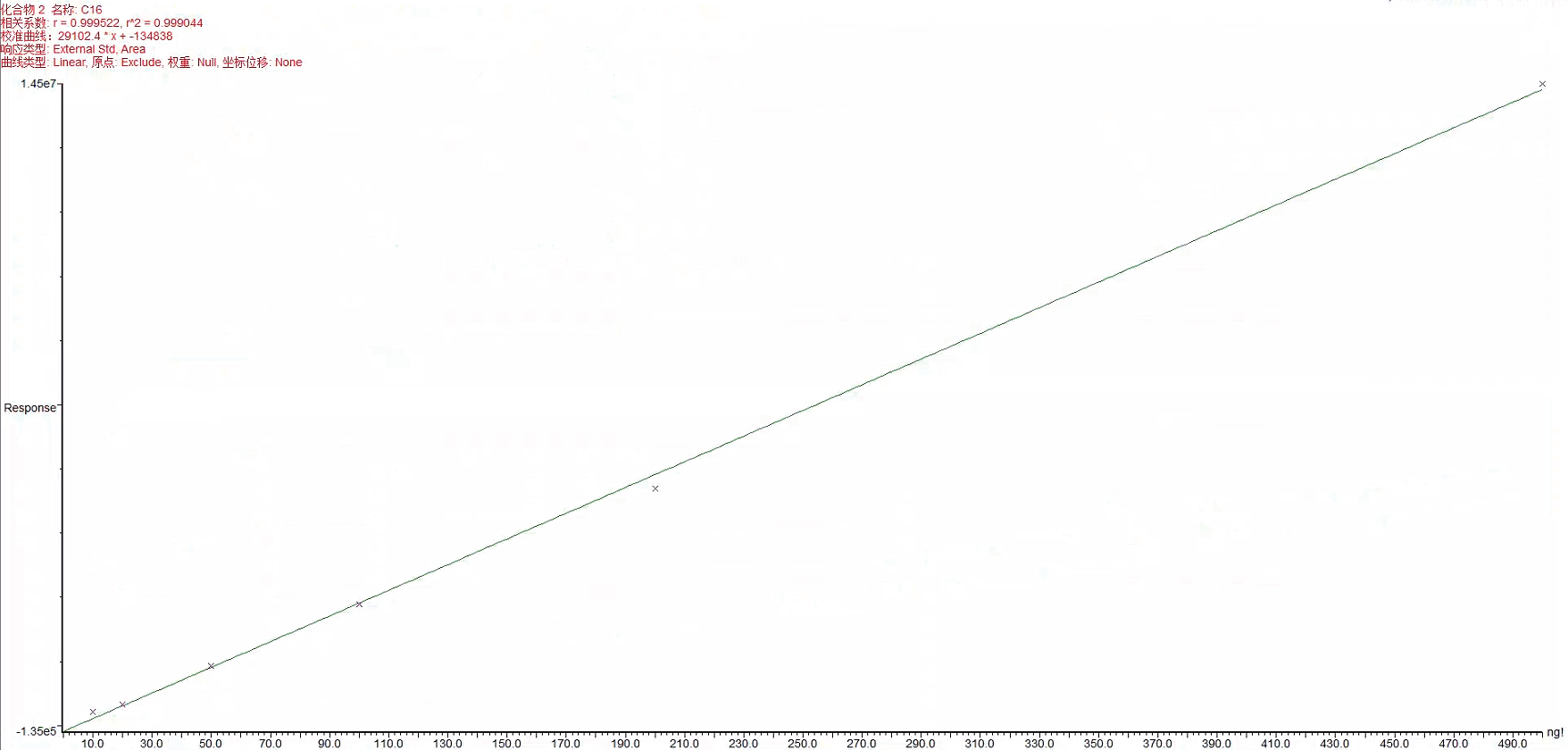配置10 μg/mL、20 μg/mL、50 μg/mL、100 μg/mL、200 μg/mL和500 μg/mL的C16標(biāo)液,分別在硅片加熱前處理系統(tǒng)中添加1 μL ,加標(biāo)量分別為10ng、20ng、50ng、100ng、200ng和500ng,校準(zhǔn)曲線如下圖所示,r²>0.999。