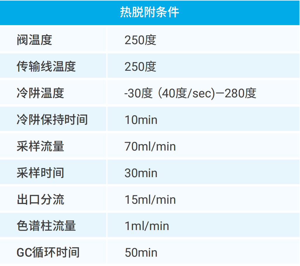 珀金埃爾默熱脫附的冷阱為三段式半導(dǎo)體冷阱設(shè)計(jì),冷阱最低溫度可達(dá)-40℃,對(duì)低沸點(diǎn)化合物有很好的捕集效果,冷阱示意圖見(jiàn)圖5,可以有效捕集C2~C3的化合物,例如乙烷、乙炔、丙烷等,見(jiàn)圖6。