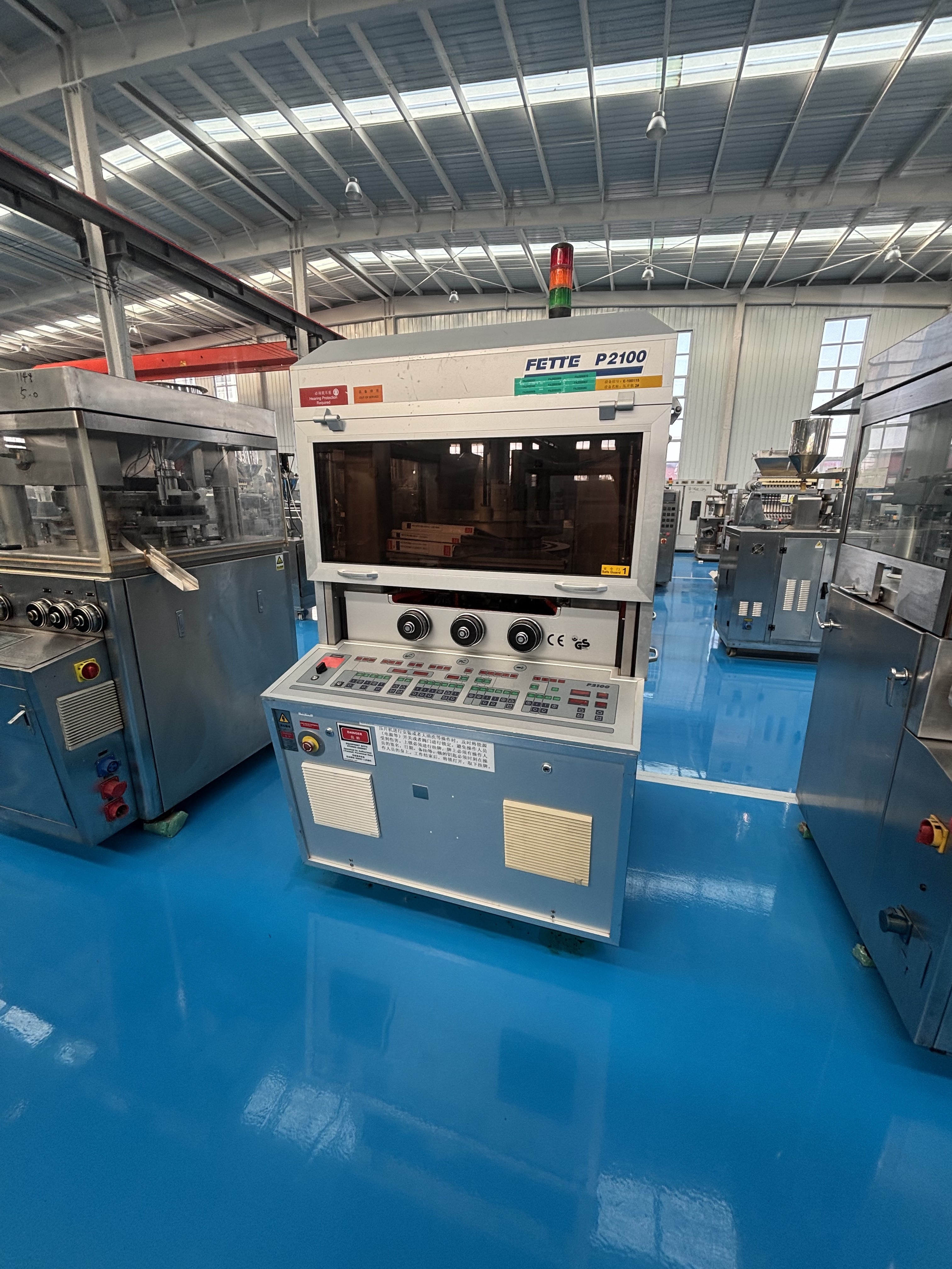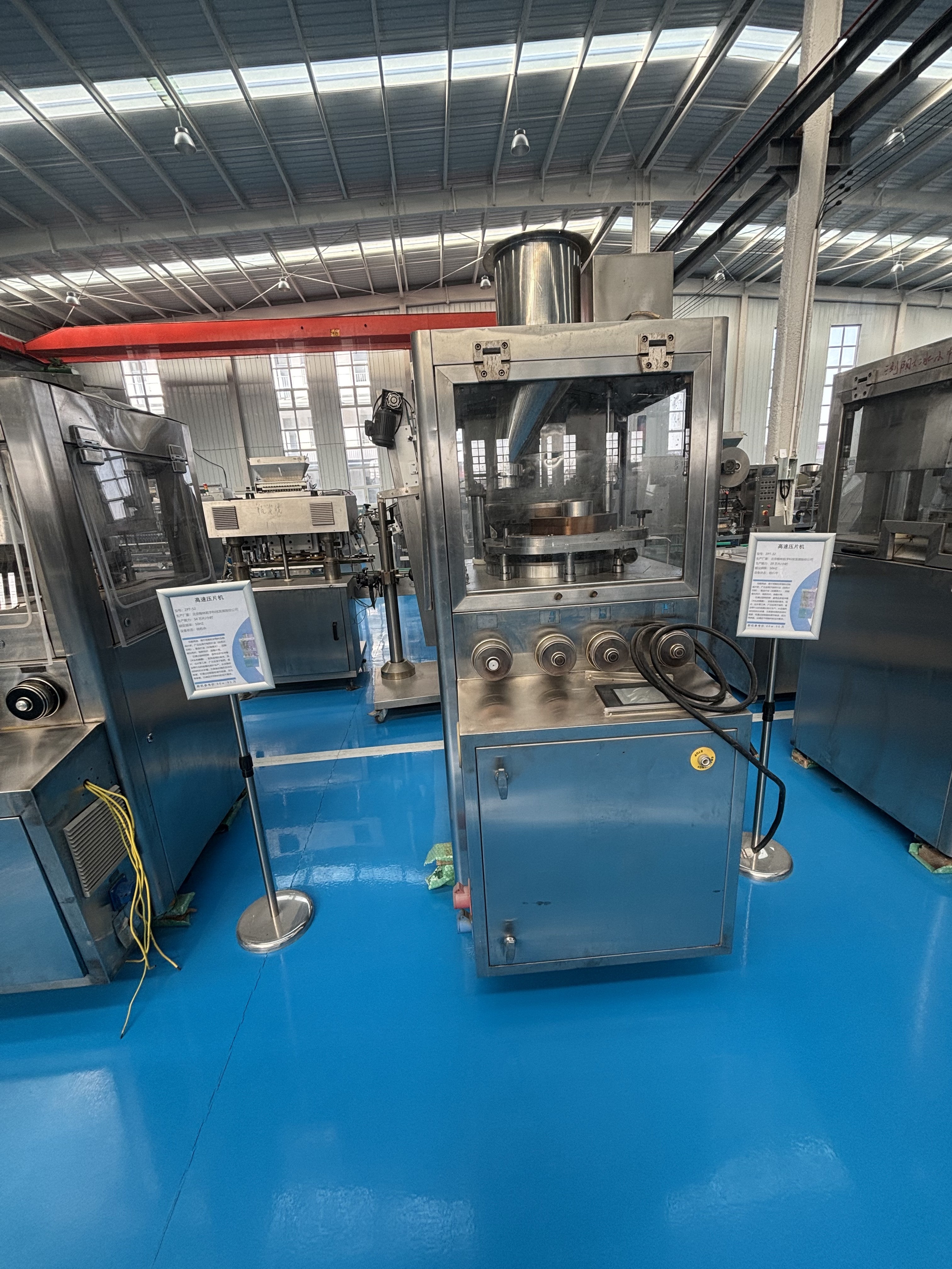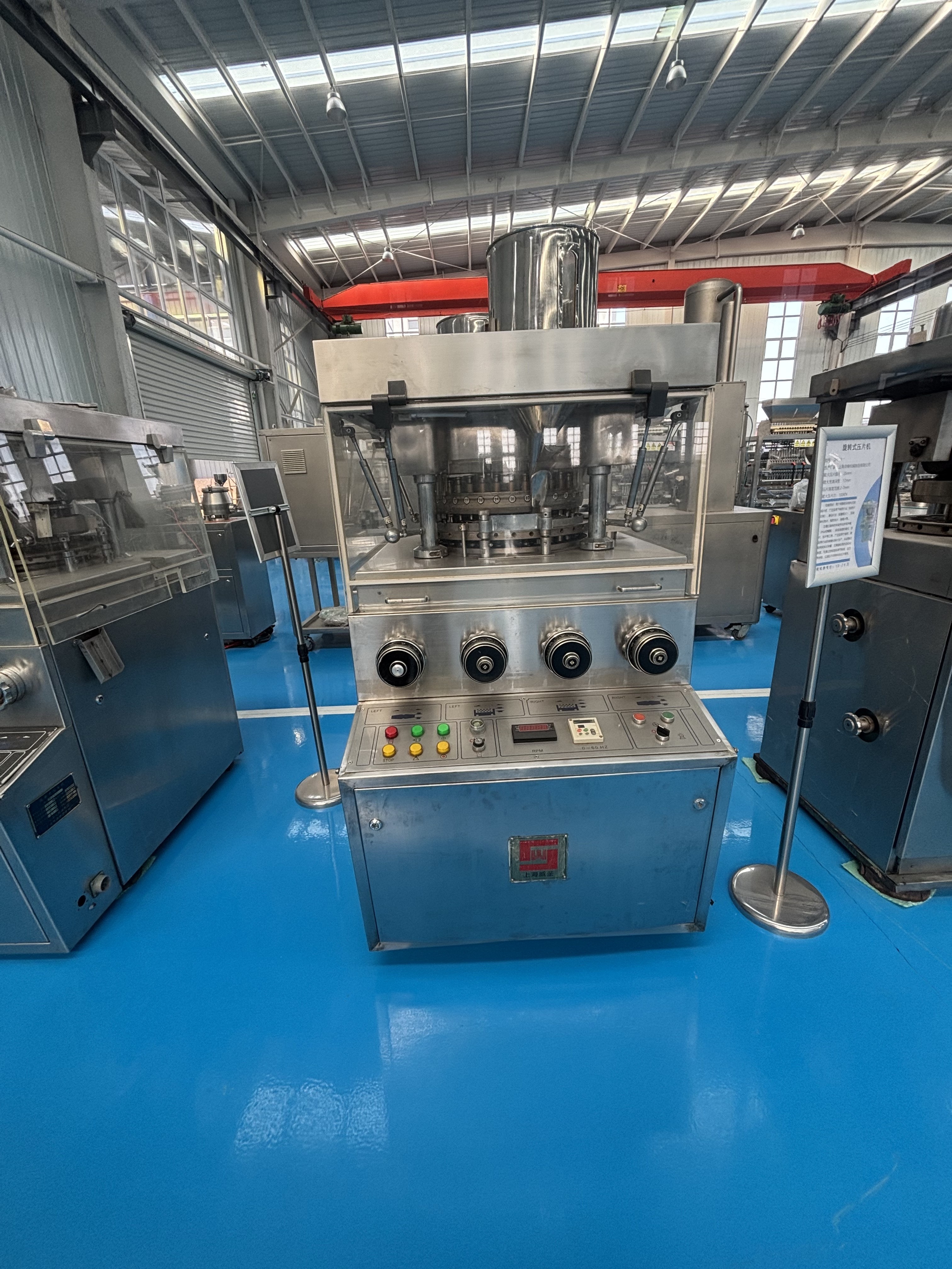 成型前需先調(diào)試設(shè)備,確保后續(xù)流程穩(wěn)定。操作人員會(huì)根據(jù)藥片的配方(如粉末流動(dòng)性、黏結(jié)性)和規(guī)格(重量、厚度、硬度),設(shè)定核心參數(shù):轉(zhuǎn)盤轉(zhuǎn)速(決定生產(chǎn)效率,一般每小時(shí)可生產(chǎn)數(shù)萬至數(shù)十萬片)、填料深度(控制每次進(jìn)入模具的粉末量,直接影響藥片重量)、預(yù)壓壓力與主壓壓力(決定藥片硬度,避免過松易碎或過緊難溶解)、出片高度(確保成型藥片能順利脫離模具)。同時(shí),部分需要控溫的物料(如易吸潮、易軟化的粉末),會(huì)提前預(yù)熱設(shè)備或模具,避免物料性狀變化影響成型。