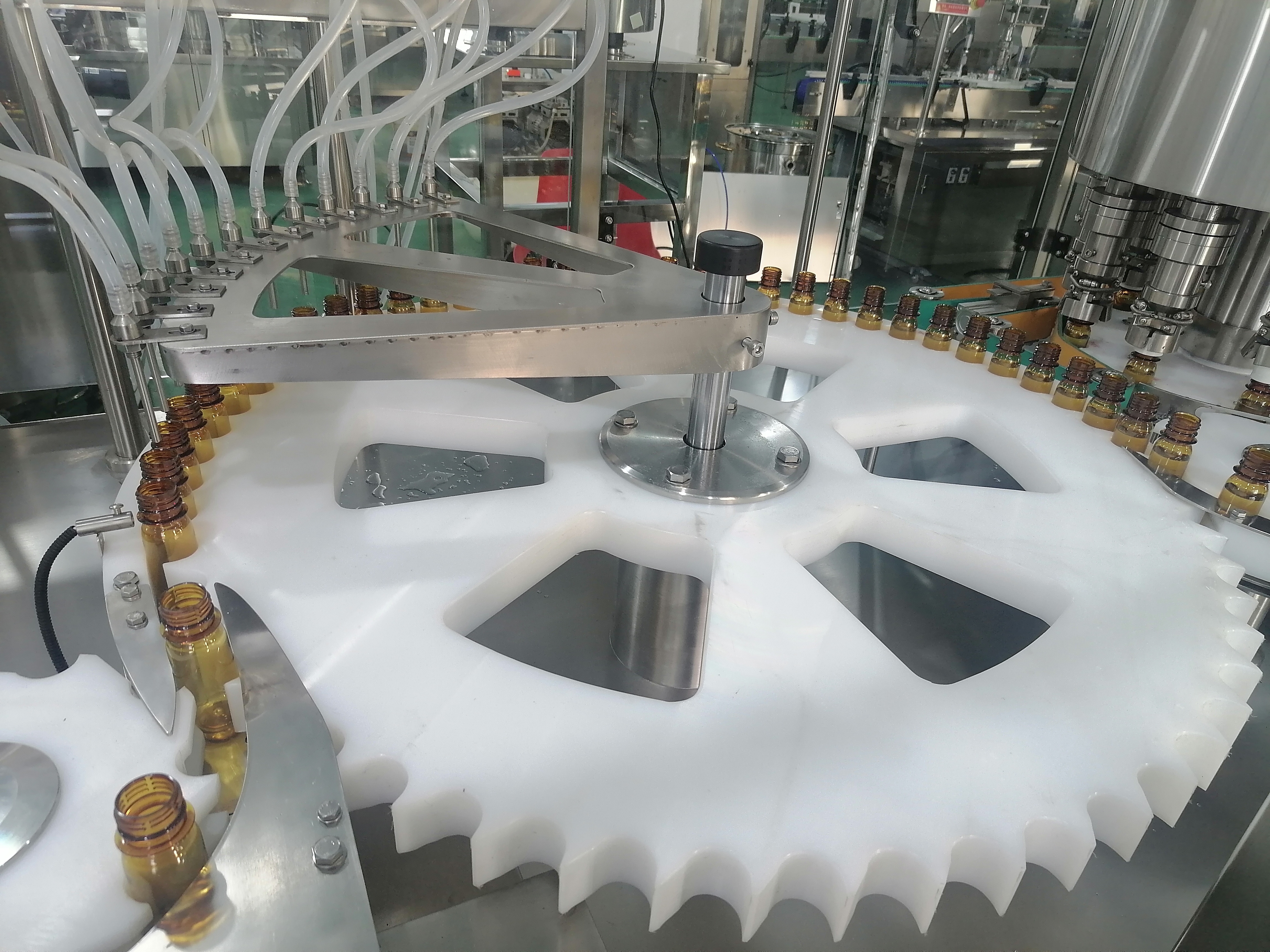 12頭灌裝與10頭旋蓋同步作業(yè)特寫】核心工序亮點(diǎn)拉滿!12頭高精度灌裝機(jī)構(gòu)同步啟停,采用蠕動(dòng)泵計(jì)量技術(shù),50ml劑量誤差控制在±0.5%以內(nèi),接觸物料僅軟管壁,杜絕藥液污染,適配各類口服液藥液需求。灌裝完成后,瓶體即刻銜接10頭跟蹤式旋蓋,隨瓶同步作業(yè)無需停機(jī),磁力恒扭矩旋蓋頭精準(zhǔn)抓蓋擰蓋,密封嚴(yán)密不滲漏。